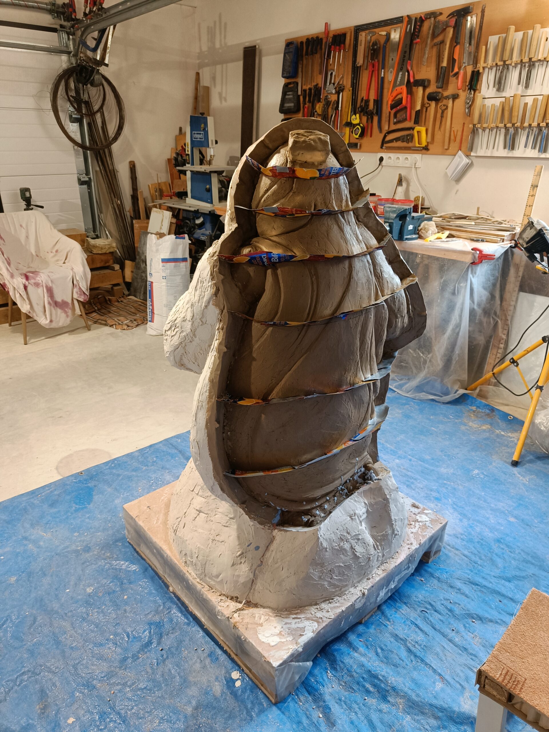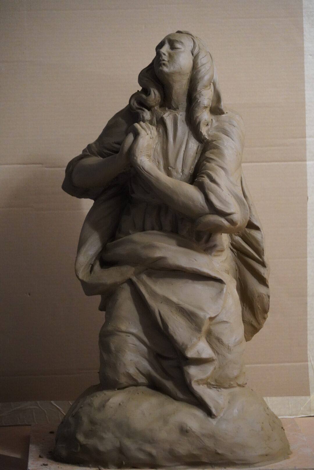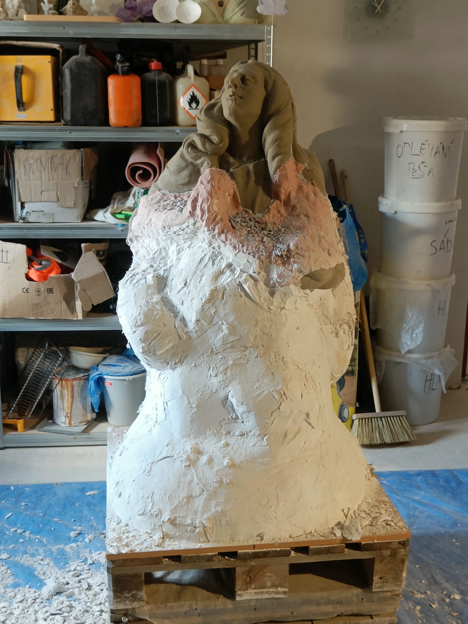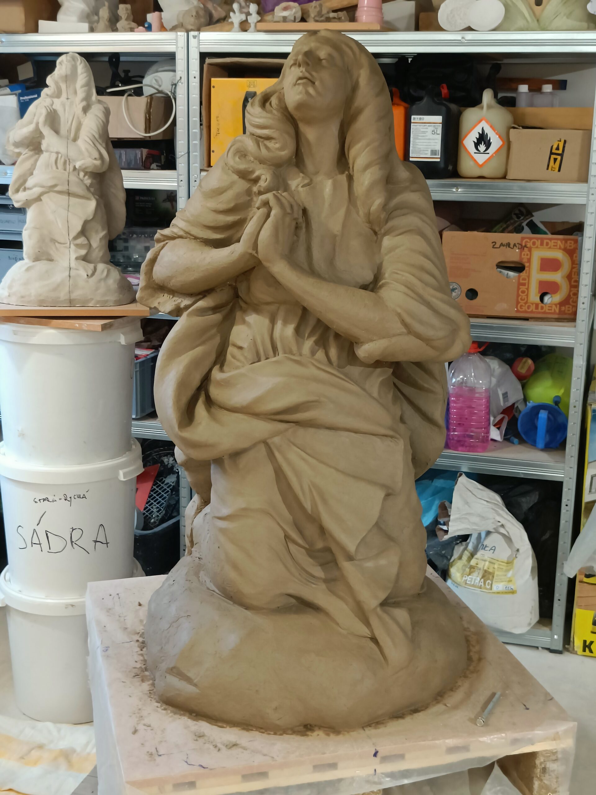Nejprve byl vytvořen grafický návrh a následně model v poloviční velikosti ze sochařské hlíny. Model byl zaformován a vydusán do materiálu, ze kterého byla následně vytvořena i výsledná socha, aby měl investor představu o konečném vzhledu sochy. Na základě tohoto bozzetta byl vytvořen finální model o velikosti 125cm ze sochařské hlíny, který byl opět zaformován a vydusán z umělého kamene. Odsekáním formy vznikl výdusek, který byl po vyzrání připraven na dotvarování kamenosochařskými dláty.