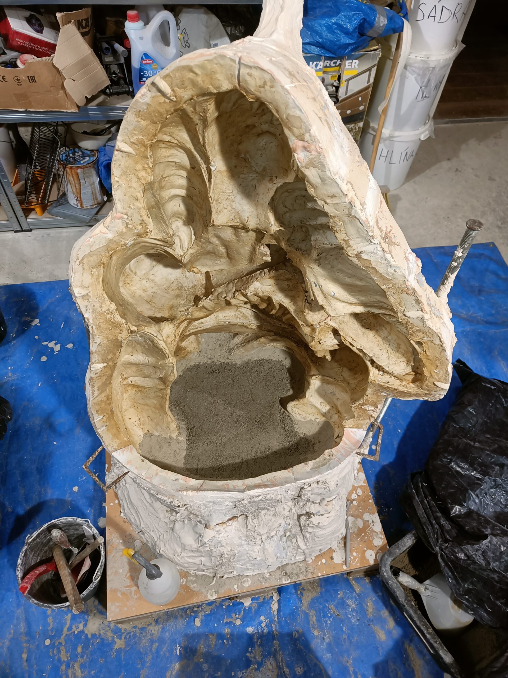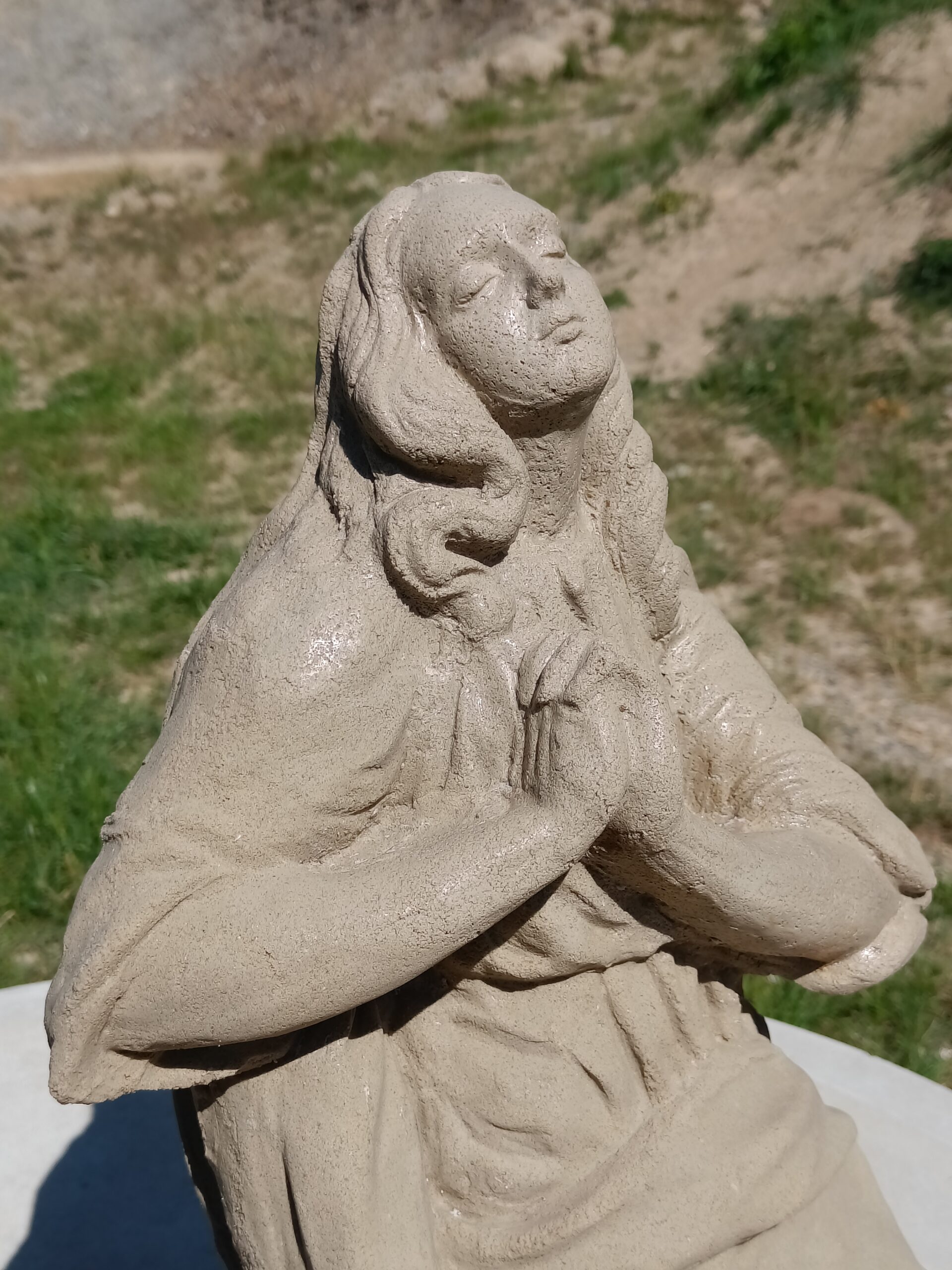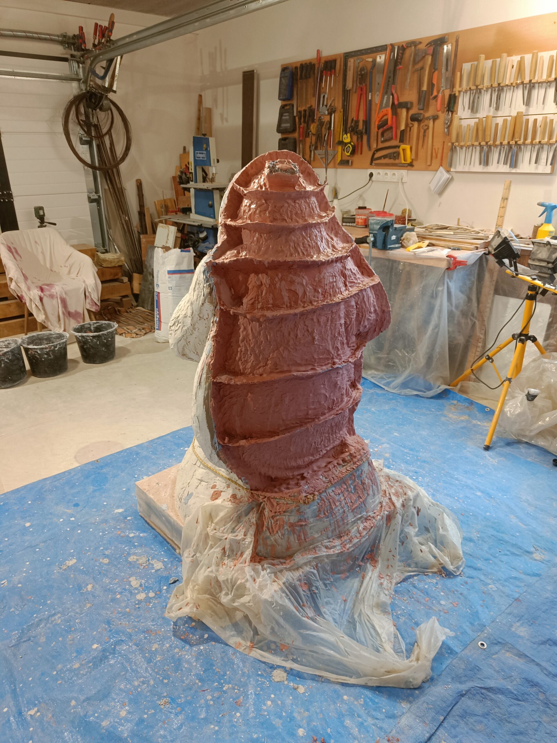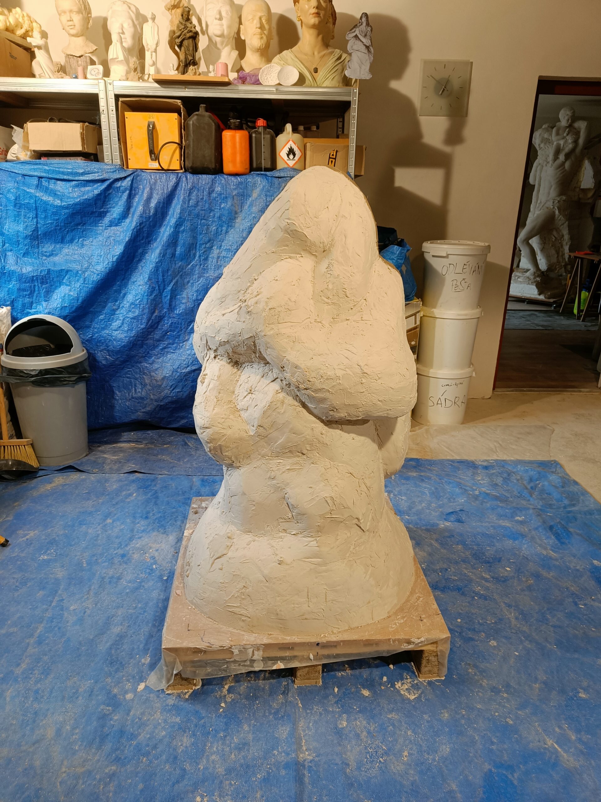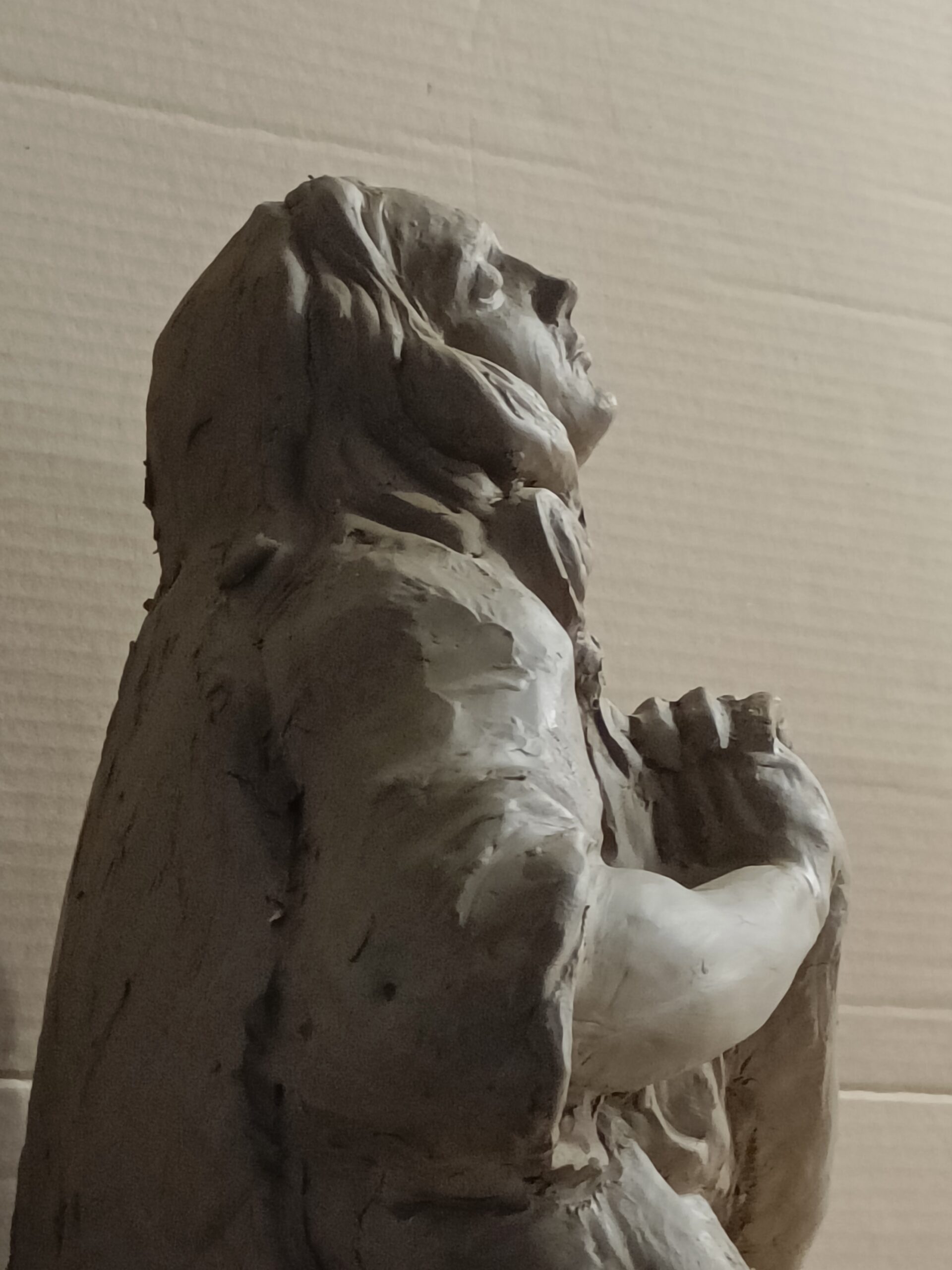 Nejprve byl vytvořen grafický návrh a následně model v poloviční velikosti ze sochařské hlíny. Model byl zaformován a vydusán do materiálu, ze kterého byla následně vytvořena i výsledná socha, aby měl investor představu o konečném vzhledu sochy. Na základě tohoto bozzetta byl vytvořen finální model o velikosti 125cm ze sochařské hlíny, který byl opět zaformován a vydusán z umělého kamene. Odsekáním formy vznikl výdusek, který byl po vyzrání připraven na dotvarování kamenosochařskými dláty.