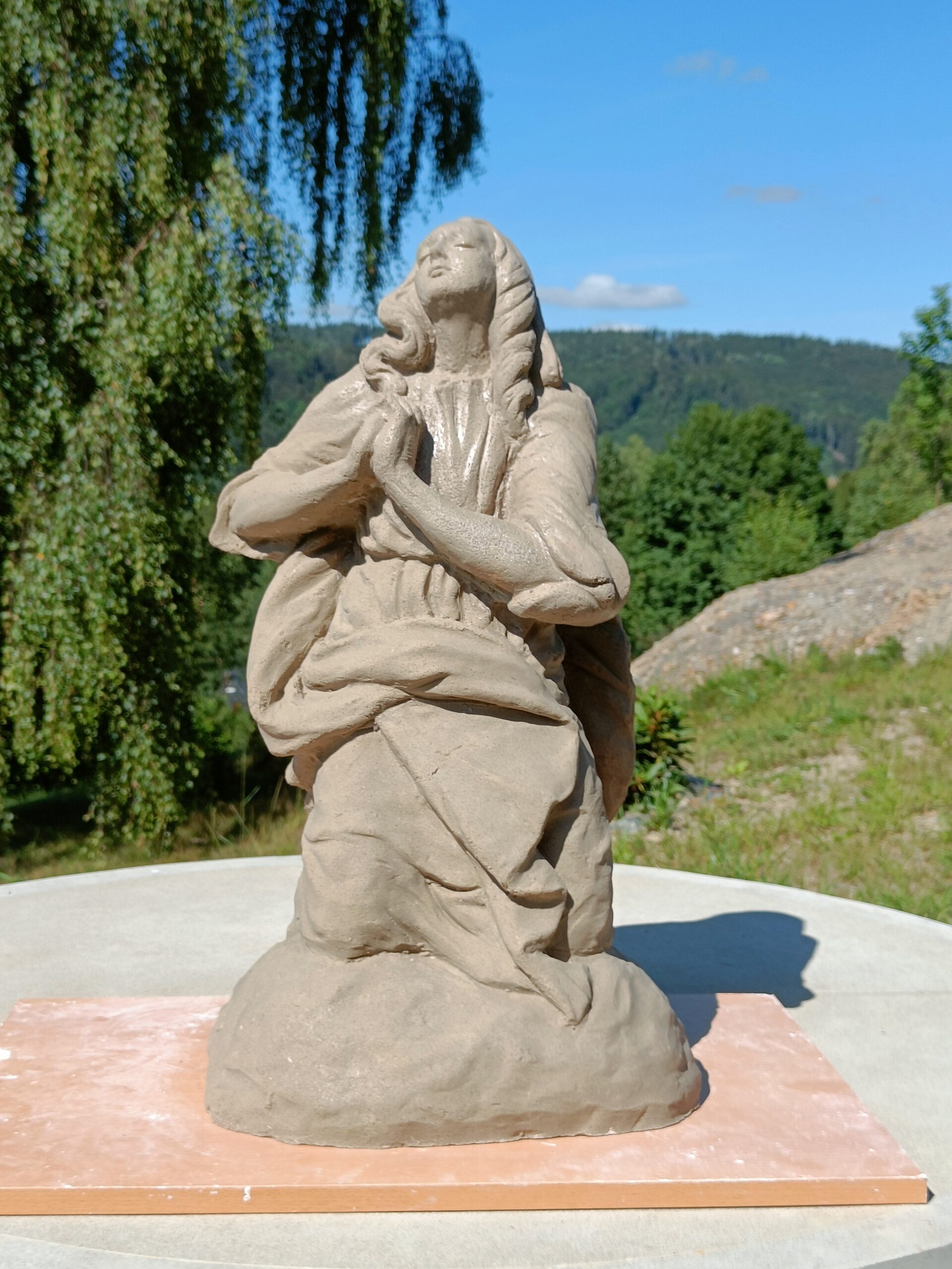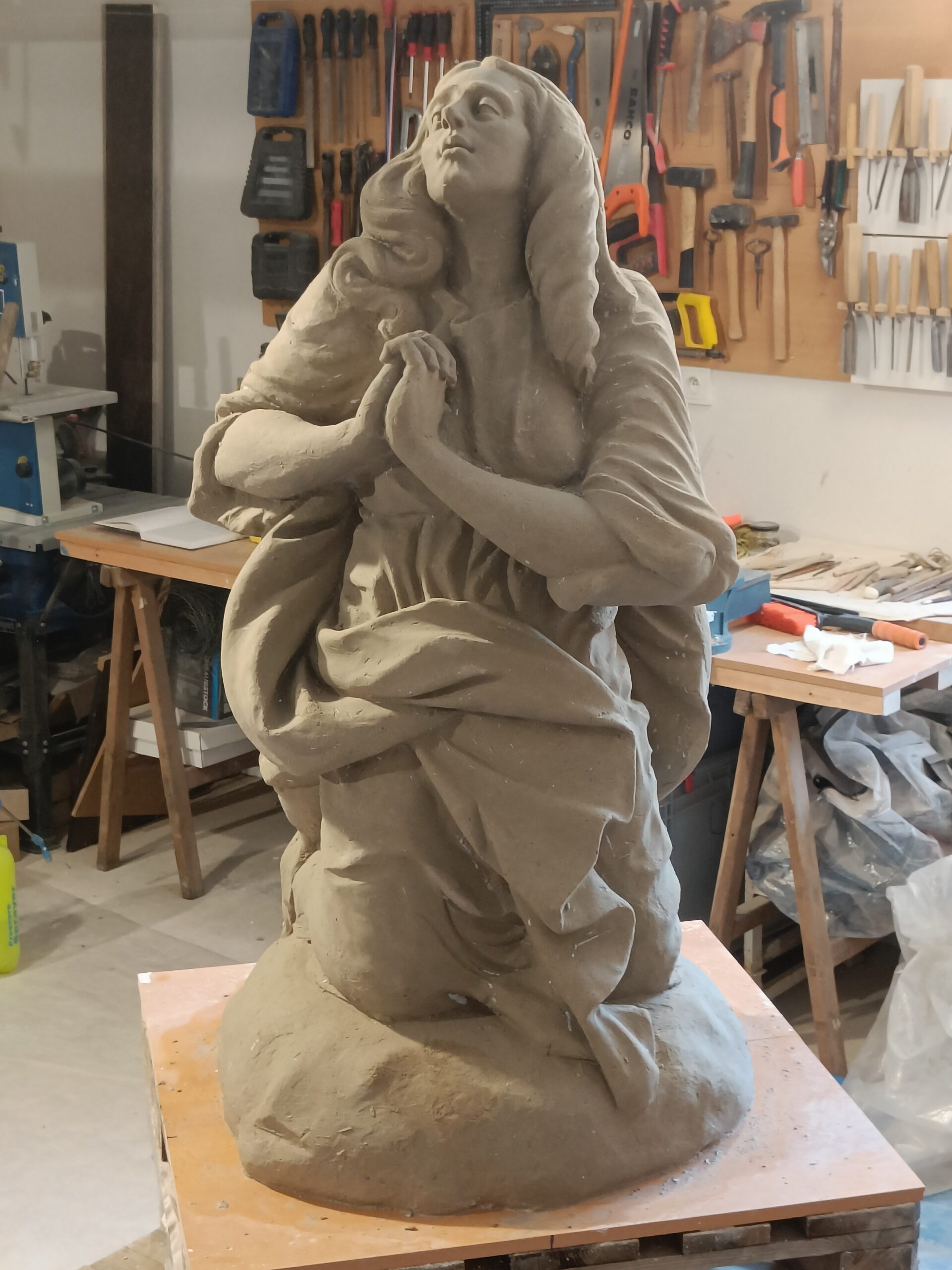 Socha Máří byla posledním sochařským objektem, který chyběl. Na křížové cestě se nachází množství různých sochařských výjevů a památkově chráněných objektů. Jedním z těchto objektů je i grotta Sv. Máří Magdaleny, ke které se bohužel nedochovala žádná fotografická dokumentace dokládající její sochařskou výzdobu. Jedinou možnou inspirací, která by se fakticky mohla opírat o reálné zobrazení Máří Magdaleny z této oblasti, byla malá fotografie sochy Sv. Máří Magdalény z křížové cesty, která se nacházela přímo ve Šluknově. Kompozičně se tedy dalo alespoň lehce opřít o tento zdroj. Máří ze Šluknova byla nicméně kompozičně zrcadlově otočena, než bylo vhodné pro Máří do Království, čemuž nasvědčoval, jak tvar grotty, tak celá kompozice křížové cesty. Po proměření grotty byla zvolena finální velikost sochy 125 cm a jako její finální materiál byl určen umělý kámen připomínající pískovec.