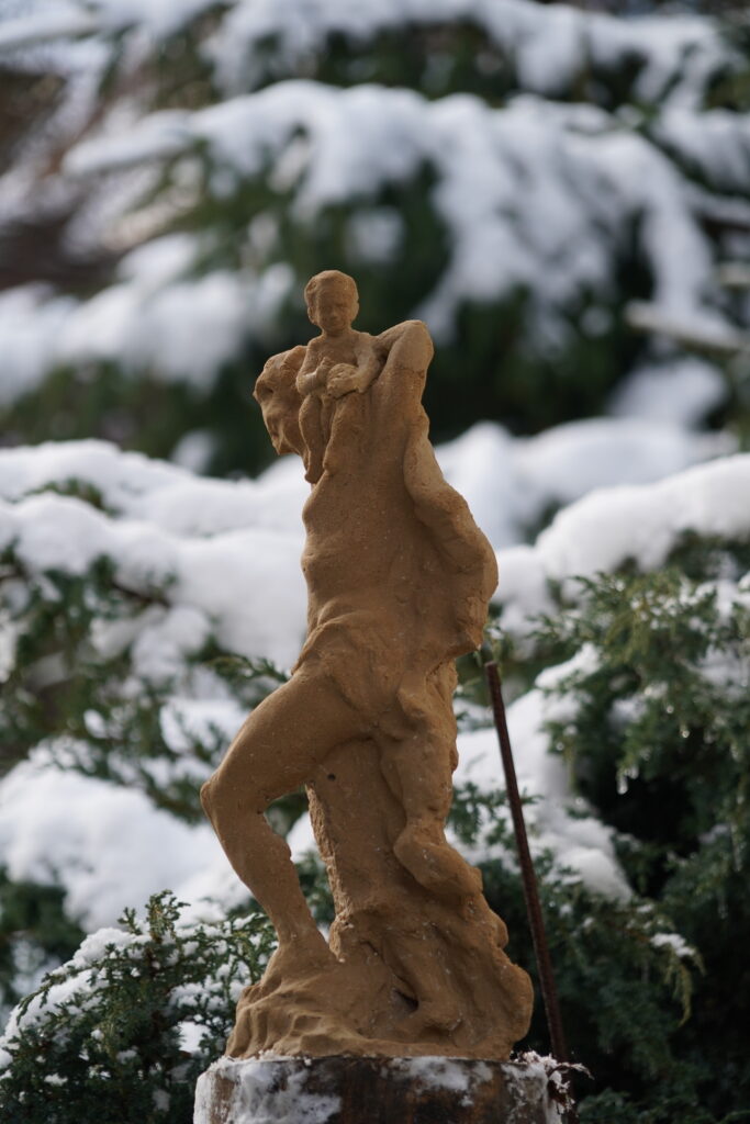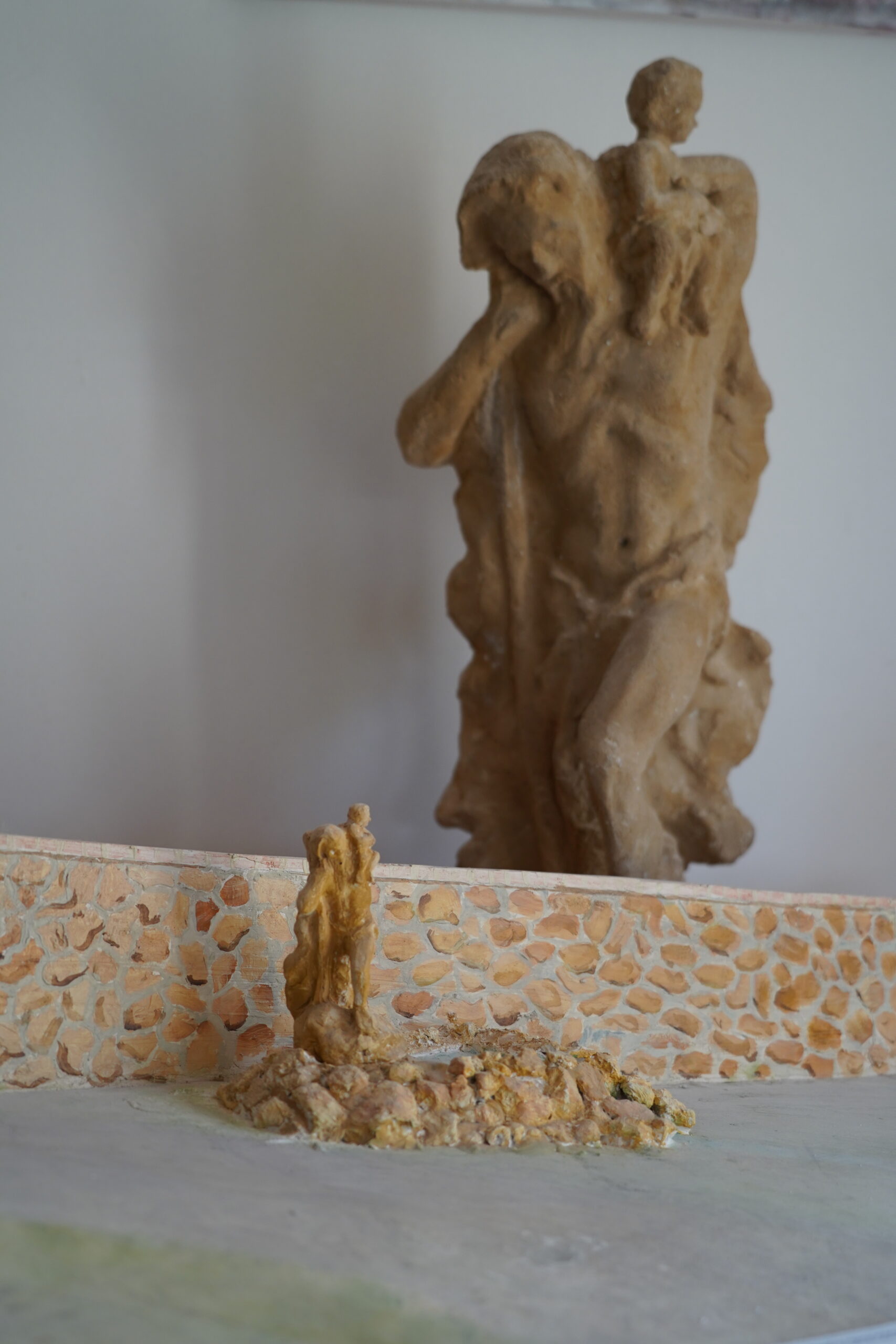 Zásadním okamžikem byl návrh od NPÚ na možná umístění sochy, tak abychom nenarušovali původní vzhled kostela ze směru od centra obce. Jedním z možných míst bylo na severní straně u hřbitovní zdi, kde se nachází cesta k nádraží. Z tohoto místa jsem byl naprosto nadšen. Terén v tomto místě je svažitý a působí dynamicky. Nachází se zde studánka a vchod na hřbitov a do kostela. Z mého úhlu pohledu se zde sešli veškeré důležité faktory pro sochu Sv. Kryštofa. Dynamika, vodní tok a cesty jak duchovní, tak světské. Nejdříve byl vytvořen model sochy v terénu 1:20, pro zobrazení celkového umístění sochy u hřbitovní zdi se studánkou. Následně bylo vytvořeno bozzetto sochy 1:5 v umělém kameni a poté sádrový model v životní velikosti 250 cm, aby bylo možné jej převést do kamenného materiálu.